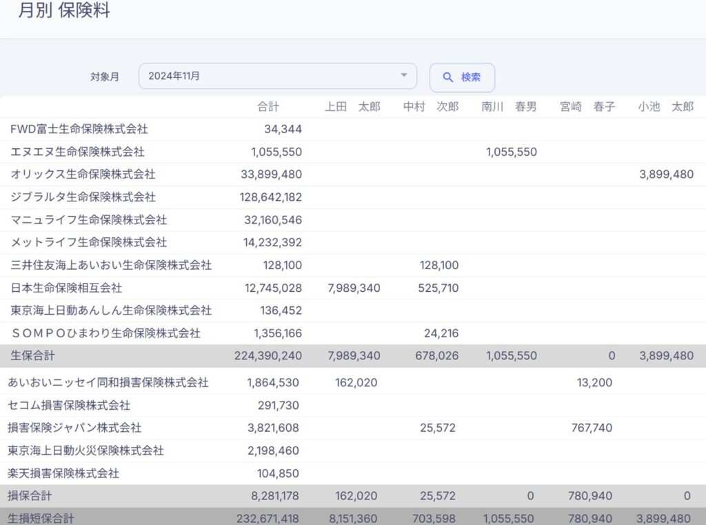 POINT収入保険料を保険会社別、月別、募集人別、部門別に自動集計します。